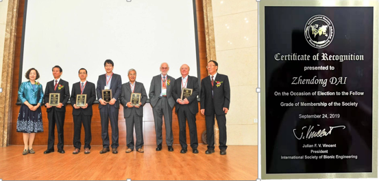 9月23日至26日,在吉林长春召开第六届国际仿生工程大会(ICBE 2019)和2019年自然启发技术国际研讨会(ISNIT 2019),此次会议由国际仿生工程学会(International Society of Bionic Engineering, ISBE)和韩国机械工程师学会(Korean Society of Mechanical Engineers, KSME)联合举办,会议主题涉及生物力学、仿生结构与材料、仿生表面、工业应用仿生学、仿生和生物机器人、运动系统和人工智能等国内外仿生工程研究的热点领域,会上举行了“国际仿生工程学会会士”颁奖典礼。我校酷爱成人网 仿生结构与材料防护研究所戴振东教授,荣获“国际仿生工程学会会士”称号。