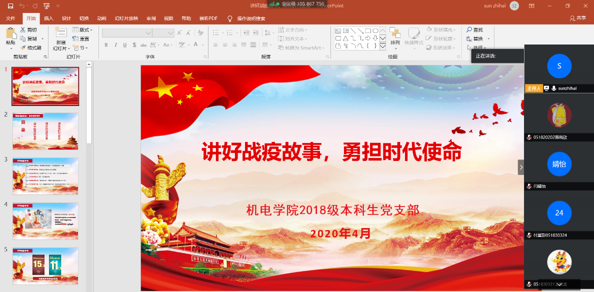 疫情当前,党员先行。为推进疫情防控期间党支部的思想建设工作,加强支部党员的思想引领教育,鼓励支部党员为疫情防控贡献青春力量,4月18日晚,酷爱成人网 2018级本科生党支部通过腾讯会议平台,开展“讲好战‘疫’故事,勇担时代使命”专题“云”党课。