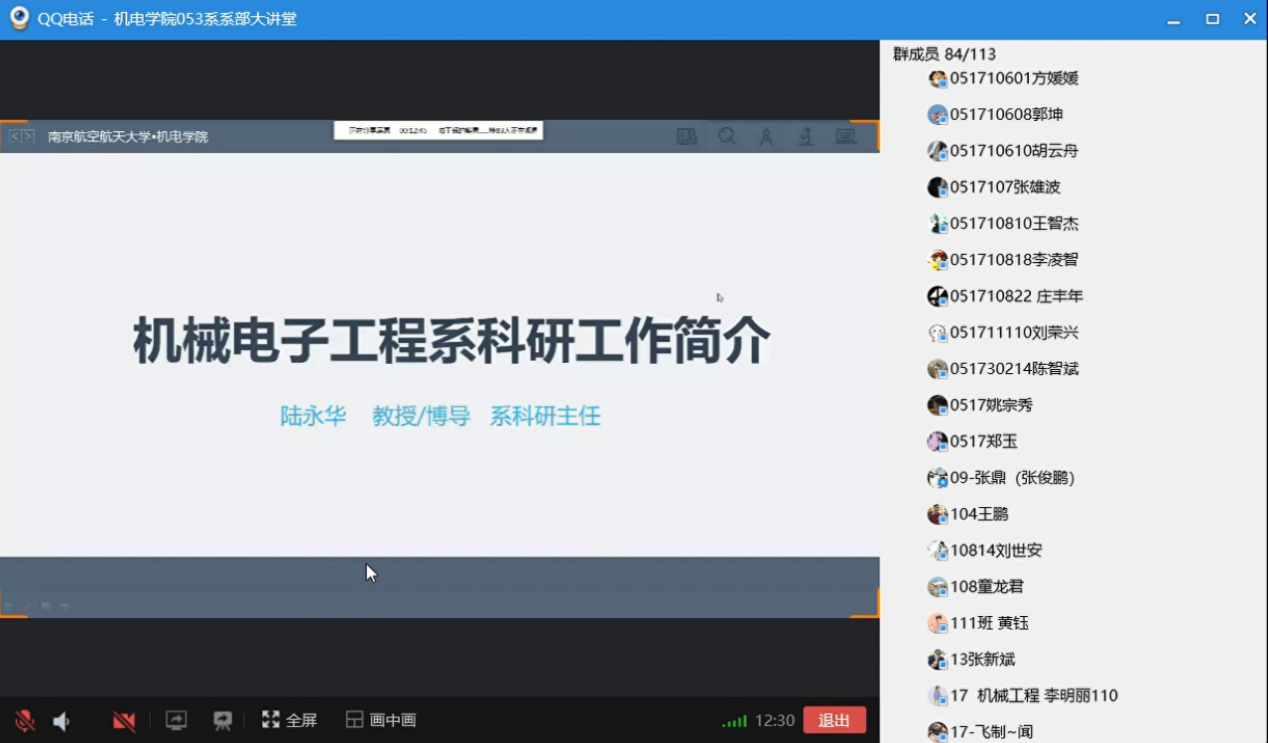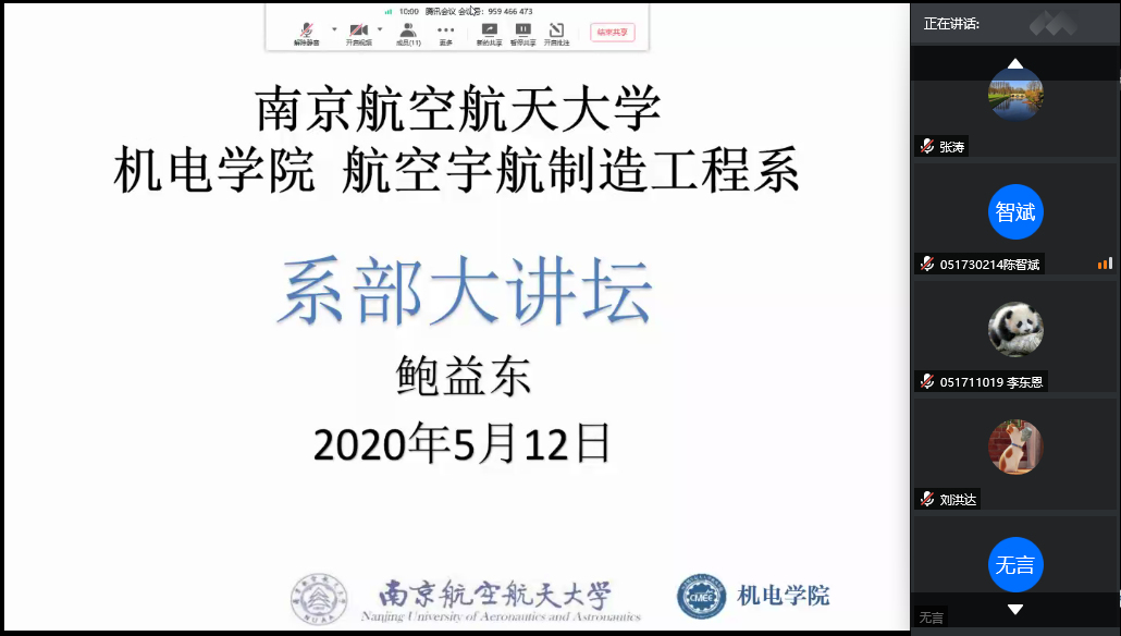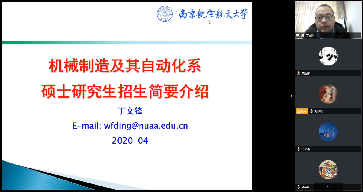 为进一步扩大学科影响,提升学院研究生生源质量,营造浓厚的深造氛围,4月20日到5月12日,酷爱成人网 2017级成功开展了4次线上系部大讲堂活动。本次大讲堂活动邀请到了设计工程系副主任郭勤涛、机械制造及其自动化系副主任丁文锋、机械电子工程系副主任陆永华和航空宇航制造工程系副主任鲍益东作为主讲人,采用线上会议的方式为酷爱成人网 学生介绍科研团队、研究方向等内容。本次系列活动由2017级本科生辅导员刘洪达主持。