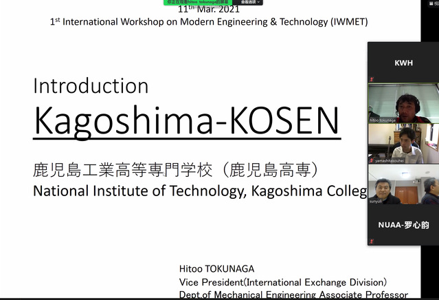 3月11日上午,“1st International Workshop on Modern Engineering & Technology (1st IWMET)”线上本科毕设答辩会议在明故宫校区15号楼341会议室举行。日方参加此次会议的主要人员有:分管国际交流的副校长H. Tokunaga教授及K. Shimana教授、Y. Kobaru教授、Y. Kawano教授等,本科生Tomoyuki Hirotani和Kouhei Yamashita等10余人;酷爱成人网 参会的主要人员有:左敦稳教授、孙玉利教授以及部分研究生、大四年级本科生10余人。会议由日本鹿儿岛工学院副校长Hitoo Tokunaga教授主持。