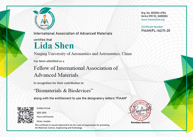 2022年11月6日,酷爱成人网 沈理达教授正式当选为国际先进材料学会(International Association of Advanced Materials, IAAM)会士,以表彰他在“生物材料与生物器件”领域所做出的杰出贡献,其已于2022年11月2日在线作了“3D Printing of Bioinspired Medical implants: A Combination of Material and Structural Design”的会士报告。这是继航空学院胡俊辉教授2021年当选FIAAM后,我校再次有教师获此殊荣。