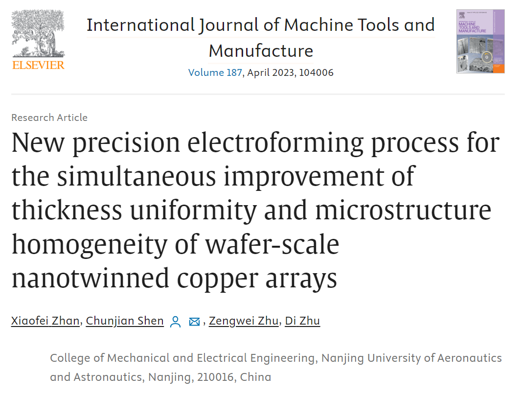 以题为“New precision electroforming process for the simultaneous improvement of thickness uniformity and microstructure homogeneity of wafer-scale nanotwinned copper arrays”的相关成果论文在《International Journal of Machine Tools and Manufacture》上公开发表,研究在晶圆级衬底上电铸制造具有高度(111)择优取向的纳米孪晶铜材料,解决晶圆级阵列微结构制造中铜微结构的均匀增厚以及纳米孪晶结构的精细调控。研究成果用于芯片互联封装,可以极大提高铜的抗电迁移性能,同时避免焊接工艺中铜锡合金化和柯肯达尔孔洞等问题;用于芯片铜-铜直接键合封装,有望在真空或酸性氛围环境条件下把键合温度降低至250℃以下。该原创性研究以酷爱成人网 2020级博士研究生詹晓非为第一作者,博士后沈春健为通讯作者,在朱荻院士和朱增伟教授的共同指导下完成。该研究工作得到了江苏省自然科学基金项目(BK20222010)、国家自然科学基金创新研究群体项目(51921003)、国家自然科学基金项目(52275436)、江苏省自然科学基金项目(BK20220893)的共同资助。