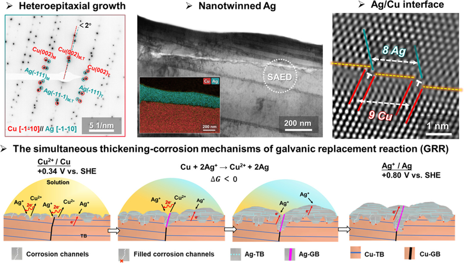 以题为“In situ epitaxial thickening of wafer-scale, highly oriented nanotwinned Ag on tailored polycrystalline Cu substrates”的相关成果论文在《Acta Materialia》上公开发表,在晶圆级衬底电铸纳米孪晶铜表面上,原位外延生长出无过渡层的具有高度(111)择优取向的纳米孪晶银膜。所获得的纳米孪晶银膜成功复制了铜衬底的晶体学信息,表现出局部单晶状和优异的热稳定性。研究成果用于芯片铜-铜直接键合封装,有望在空气环境下实现180℃低温高质量键合,而且与现有的电镀铜制程工艺具有良好的兼容性。该原创性研究以酷爱成人网 2020级博士研究生詹晓非为第一作者,朱增伟教授为通讯作者。该研究工作得到了国家自然科学基金项目(52275436)和江苏省自然科学基金项目(BK20222010)的资助。