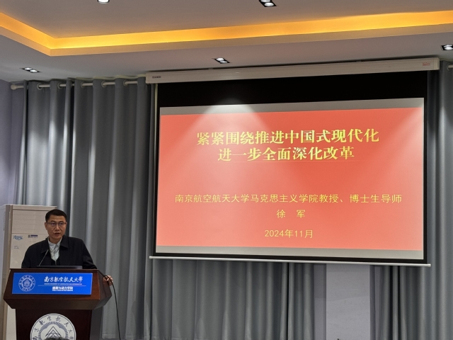 马克思主义学院副院长徐军以《紧紧围绕推进中国式现代化进一步全面深化改革》为题,从“深入理解进一步全面深化改革的历史方位”、“系统把握进一步全面深化改革的战略部署”、“提高党对进一步全面深化改革的领导水平”三个方面,对党的二十届三中全会精神和习近平总书记重要讲话精神予以系统阐释和宣讲。宣讲分析透彻、案例丰富,为大家深刻领会习近平总书记关于全面深化改革的一系列新思想、新观点、新论断,以及系统把握进一步全面深化改革的丰富内涵,打下了坚实的思想理论基础。