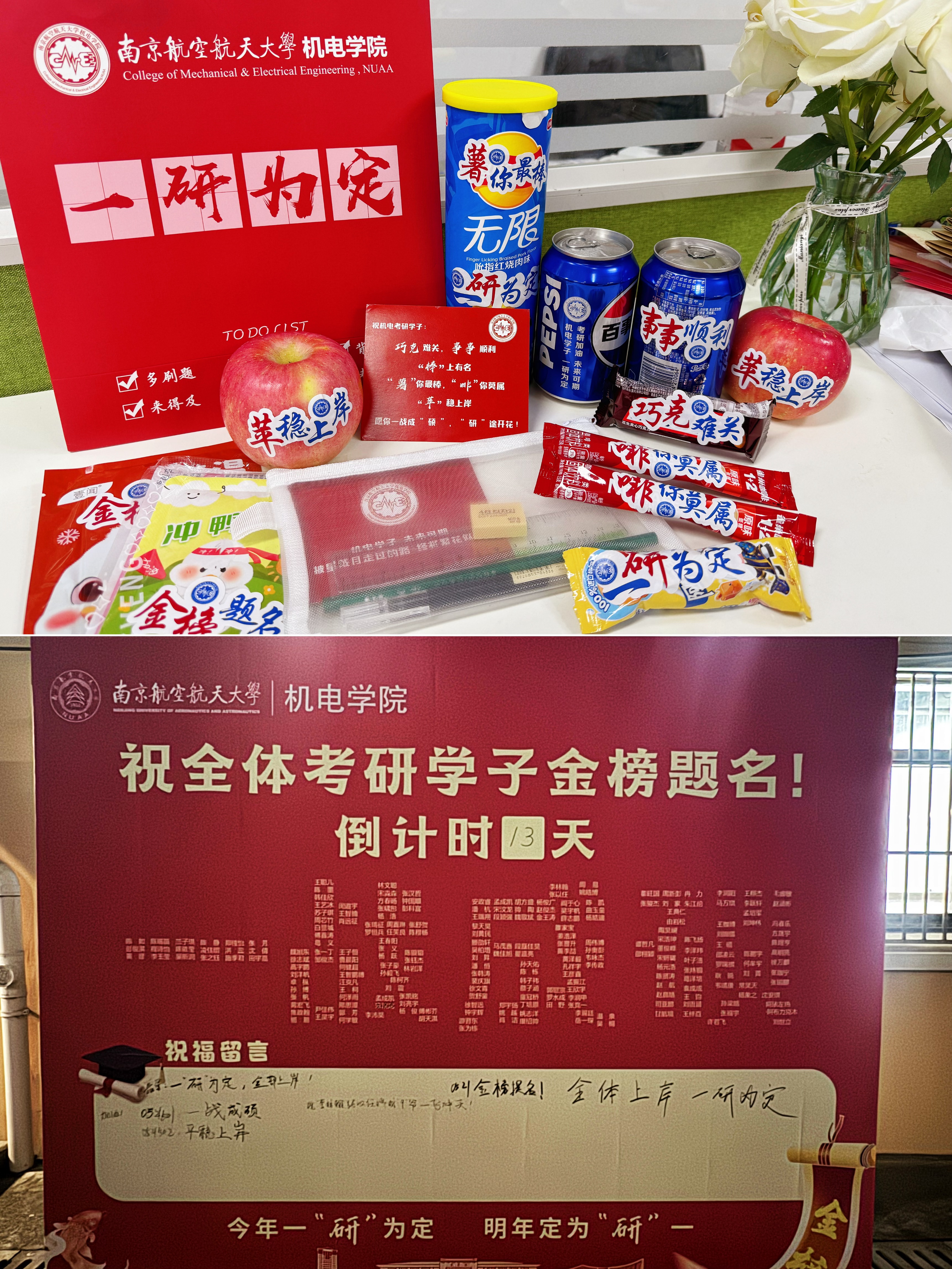 加油包寓意满满:“苹”稳上岸——苹果,“薯”你最棒——薯片,“啡”你莫属——咖啡,“巧克”难关——巧克力,“事事”顺利——百事可乐,“棒”上有名——棒棒糖,“宝”你上岸——暖宝宝,还有祝福明信片和定制文具共十件小礼物,代表对考研学子十全十美的祝福!